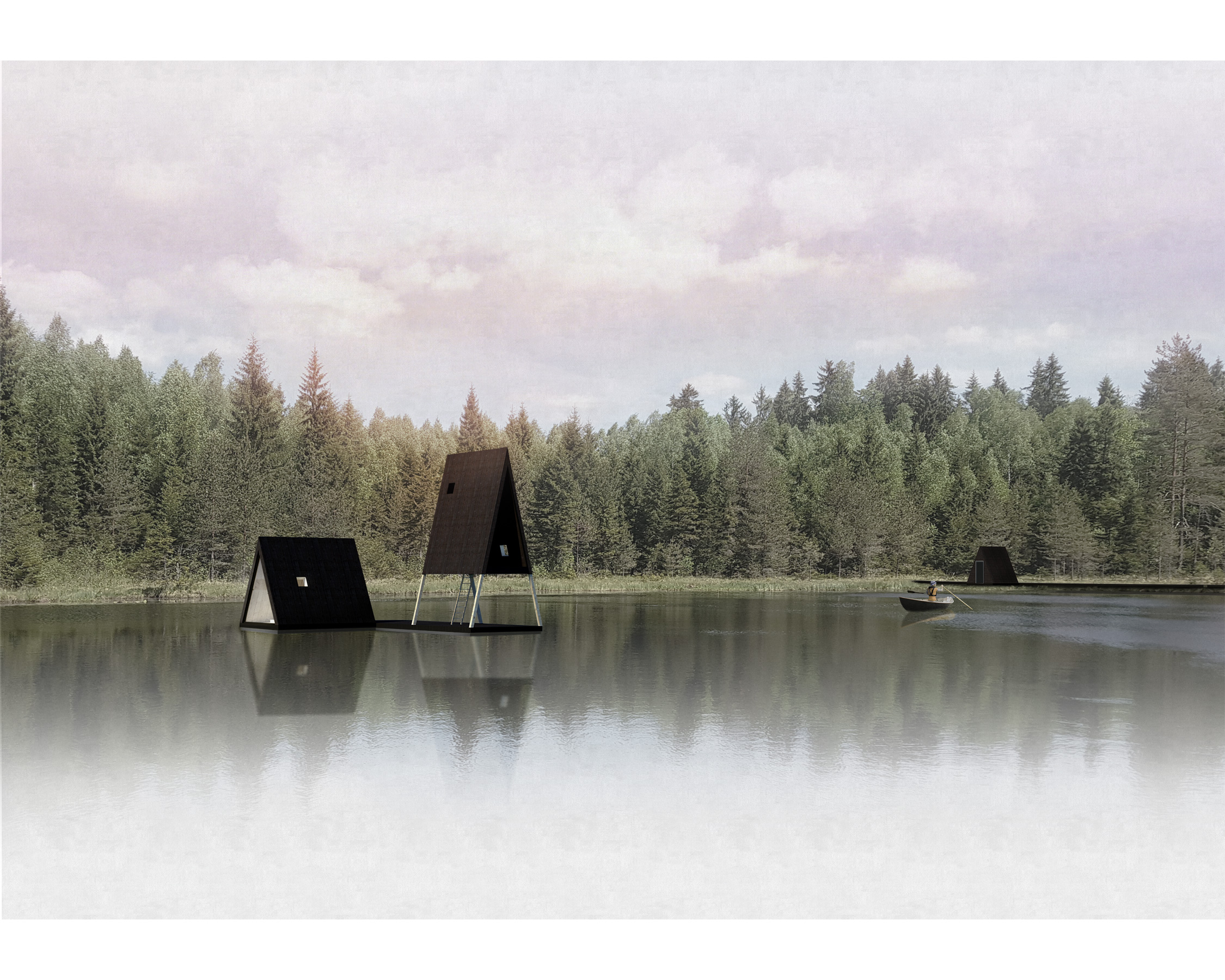 The formal language of the vernacular pitched roof is abstracted and playfully arranged to create a rich spatial sequence. Each retreat forms a point in the flowing landscape, either in the forest or on the lake. Each invites guests to float above the earth and water, between past and future, dwelling simply in the present.