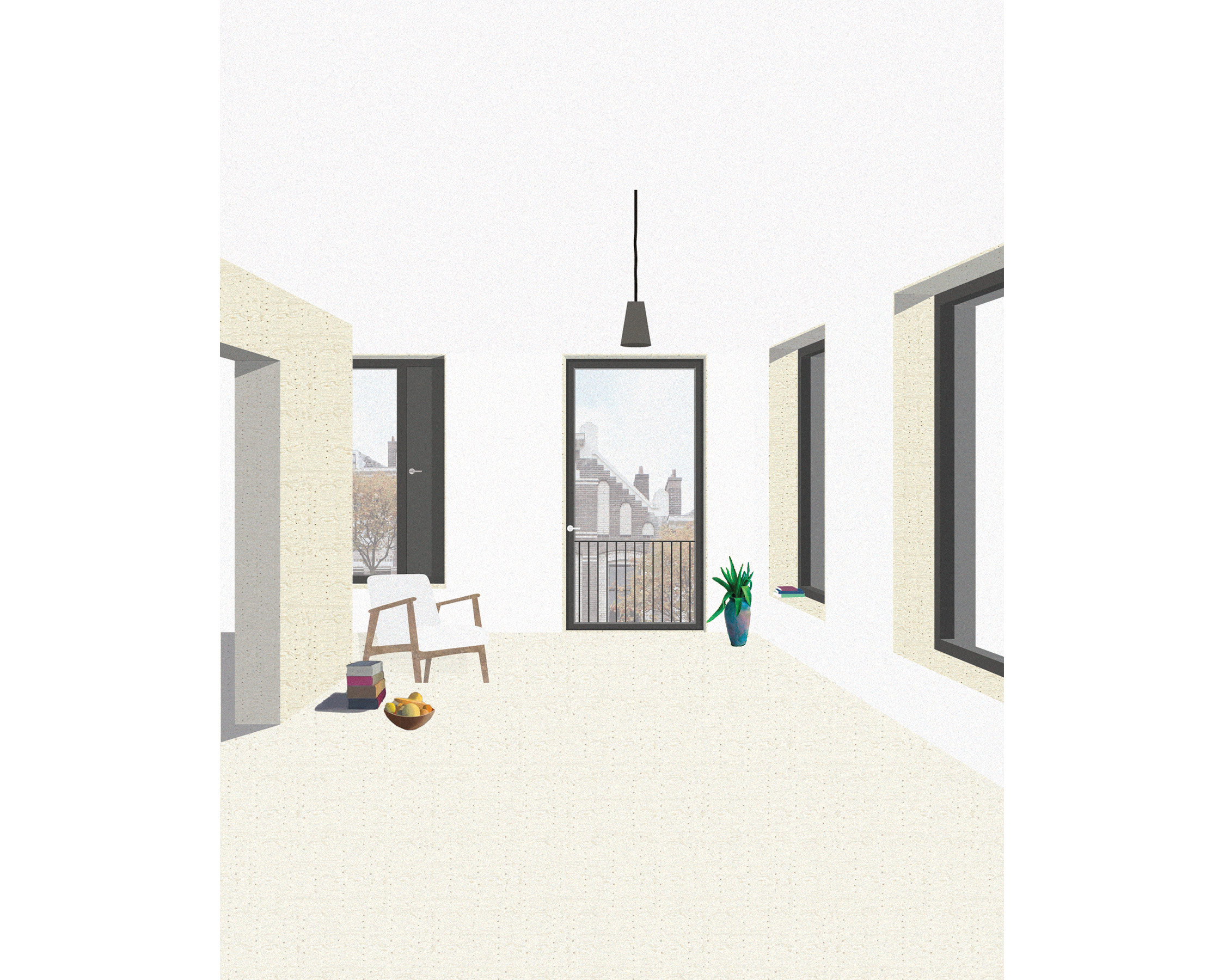 The project investigates the introduction of new housing typologies in a derelict neighbourhood on the outskirts of Rotterdam. It focuses on the window and wall as mediating elements between home and city. Futhering the articulation of transition, and in response to the need to densify the site, the design supplements compact housing forms with collective spaces for co-working, shops and small businesses. Circulation is concentrated into four vertical cores and moved within the building volume. These are wrapped by tall ground floor rooms forming urban corners, suited to cafes and shops, and further spaces at first floor for communal functions.